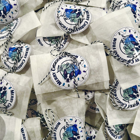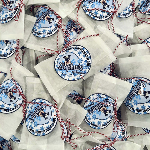 Filled with a mix of our freshly baked treats or chews to give out to your customers of guests during the holiday season.